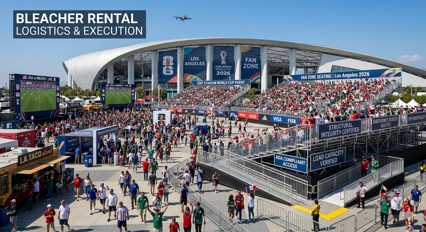 The 2026 FIFA World Cup will transform Los Angeles into one of the busiest sports cities in the world. With SoFi Stadium at the center of the action, surrounding areas will host fan zones, corporate activations, and community events. Successfully managing these activities requires meticulous logistics, setup, and execution planning for bleacher rentals.